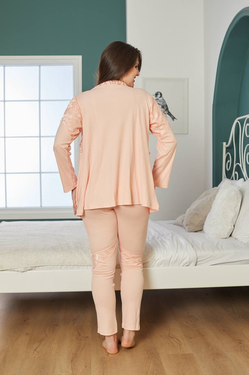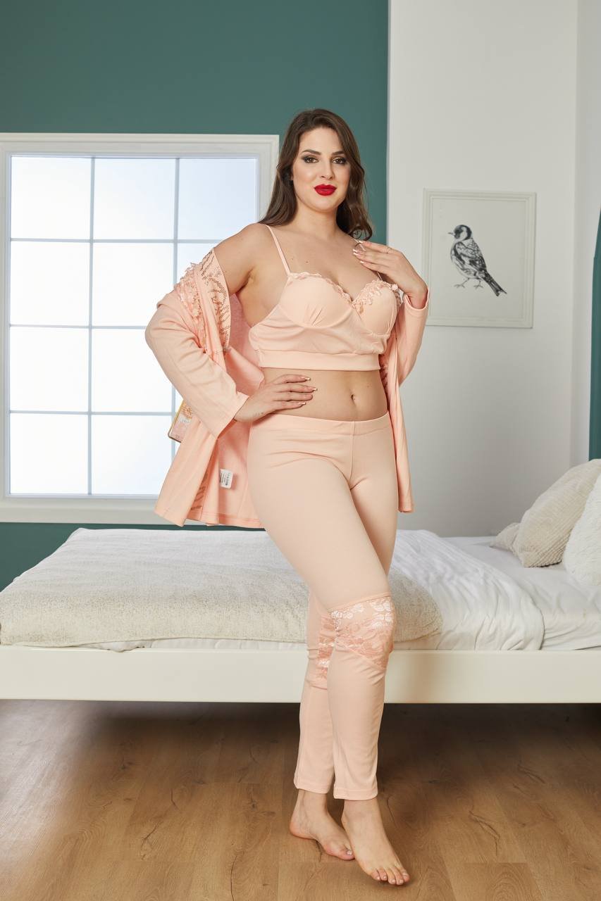 الطقم مصمم للمظهر المريح والأنيق في المنزل. يجمع بين النسيج الناعم المريح وتفاصيل الدانتيل والترتر التي تضيف مظهراً فاخراً وجذاباً.